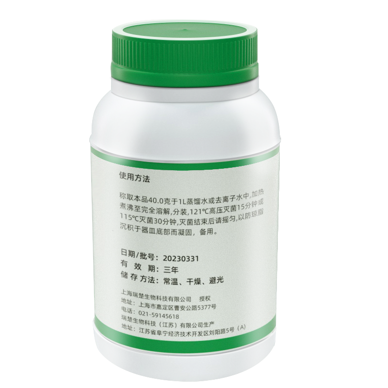 稱取本品40.0克于1L蒸餾水(shuǐ)或去離子水(shuǐ)中,加熱煮沸至完全溶解,分裝,121℃高(gāo)壓滅菌15分鍾或115℃滅菌30分鍾,滅菌結束後請(qǐng)搖勻,以防瓊脂沉積于器(qì)皿底部而凝固,備用。