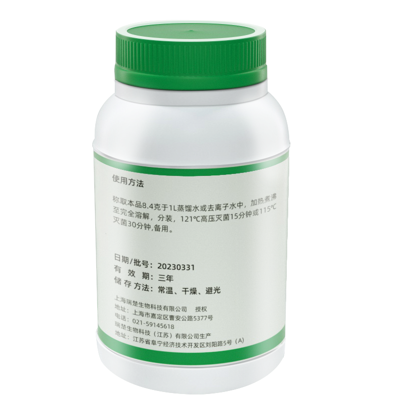 稱取本品8.4克于1L蒸餾水(shuǐ)或去離子水(shuǐ)中,加熱煮沸至完全溶解,分裝,121℃高(gāo)壓滅菌15分鍾或115℃滅菌30分鍾,備用。