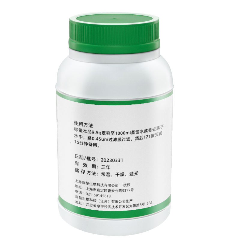 使用方法:稱量本品9.5g定容至1000ml蒸餾水(shuǐ)或者去離子水(shuǐ)中,經0.45um過濾膜過濾,然後121度滅菌15分鍾備用。